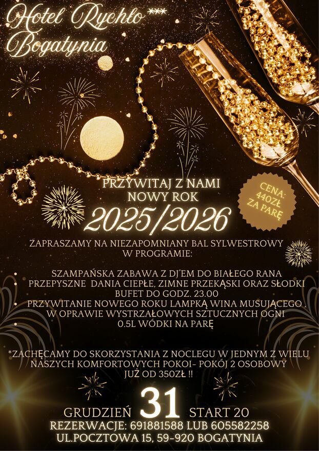 Zapraszamy www.rychlo.pl to już ostatni moment na zastanowienie się gdzie należy przywitać Nowy Rok. My proponujemy szampańską zabawę do białego rana przy suto zastawionym stole w Hotelu Rychło w Bogatyni. Dla chętnych oferujemy nocleg.Rezerwacje pod nr tel.; 691 - pokaż numer telefonu - , 605 - pokaż numer telefonu -